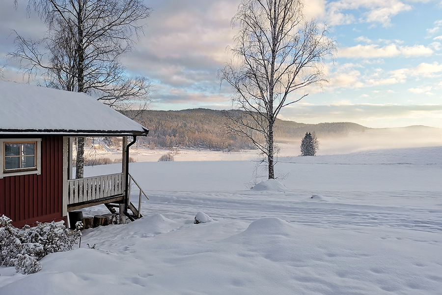 Stugan med veranda mot söder har sol året om, till och med under vinterns mörkaste del.