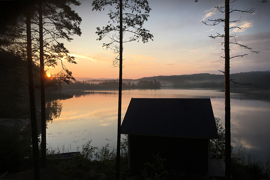 En avskild stuga, mitt i tystnaden och omgiven av skimrande vatten, skog och mjuka bergknallar. Här bor du helt ostört med sjön bara några steg bort, nära vandringsstigar, skogsbad, bäckar och kvällar som ofta avslutas med spegelblankt vatten och stjärnhimmel.